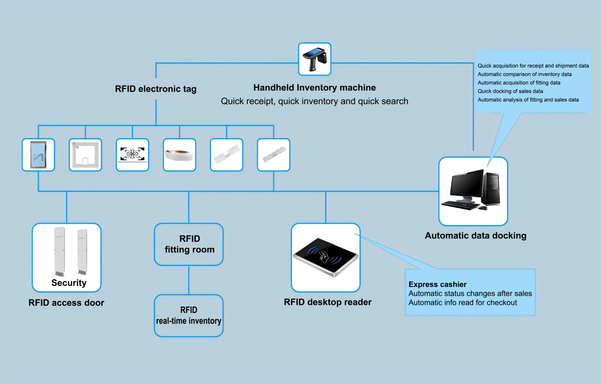 The information carried by RFID tags consists of the unique code of the chip and the information we write in the chip, attached to clothing and other goods, forming a whole. Make a single product have a unique code, as well as information such as model, production time, and location that distinguishes it from other styles of products. The use of RFD non-contact automatic recognition technology as data collection middleware can achieve data collection, filtering, integration, and transmission. On the other hand, by combining with Aurora Cloud platform technology, it can be easily integrated with enterprise management systems and provide data to other servers in a service-oriented manner, thereby achieving loose integration of internal and inter enterprise business.