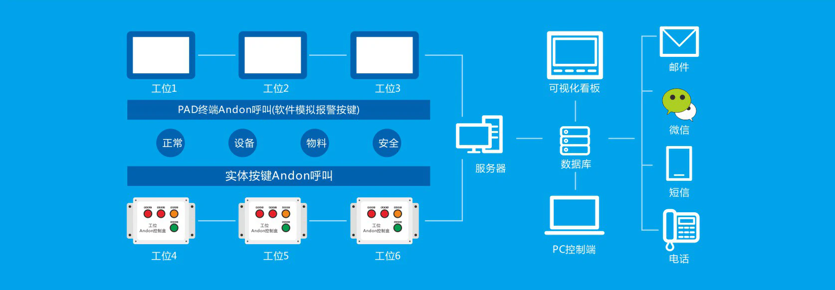 系统每个设备或工作站都装配有呼叫灯,如果生产过程中发现油管物料、质量、设备、安全等异常呼叫,通过无线上传给系统,系统回复并点亮呼叫指示灯,相关人员通过上传的信息与指示灯及时定位故障工位,使得生产过程中的问题得到及时处理。