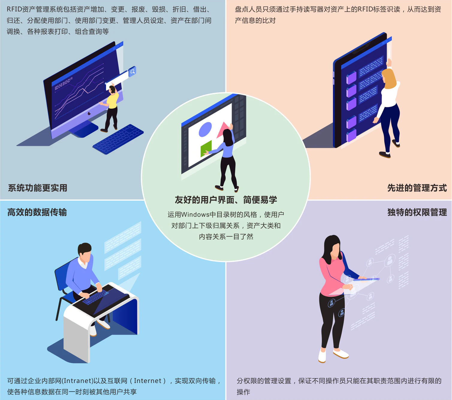 资产管理包括资产的新增、调拨、闲置、报废、维修和盘点等操作,门店资产管理是企业管理中的一个重要组成部分,但是这些资产分布非常散,平时基本无人值守,使用周期长、管理难度大等特点。针对这些问题,本系统运用RFID技术,从而实现办公用品家具、I资产、影像设备、易损件等资产的信息化管理。