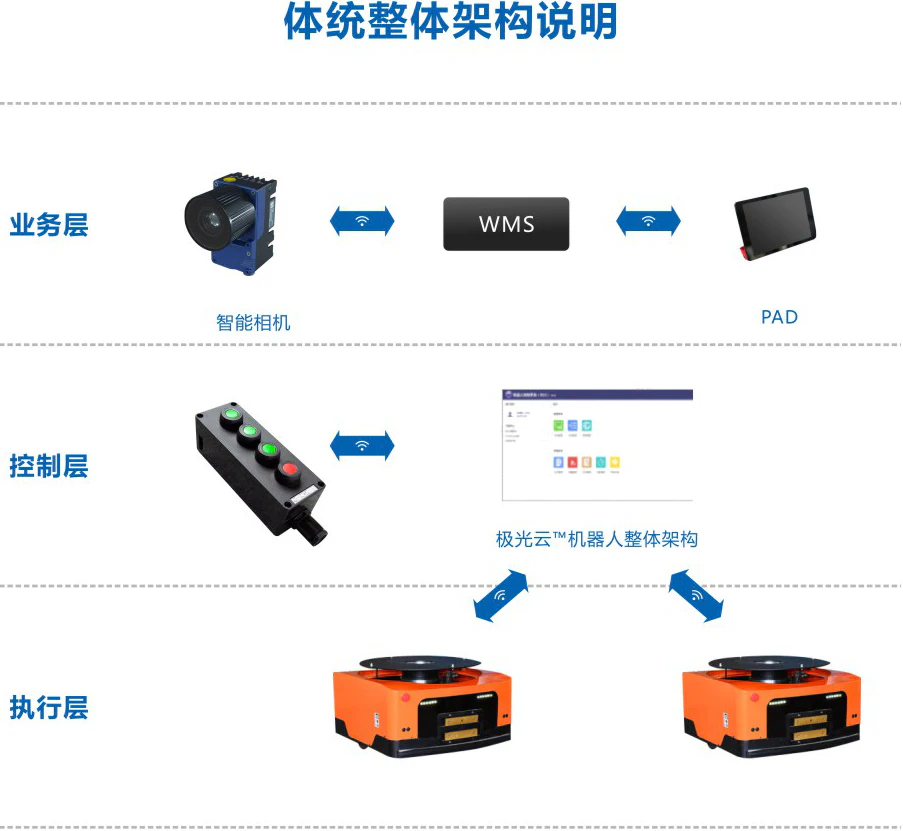 极光云™ 智能AGV配送方案由:AGV、AGV充电站、服务器、AGV调度控制系统、RCS对接接口开发、无线呼叫器、智能相机、视觉控制器、光电传感器、WIFI网络等构成。